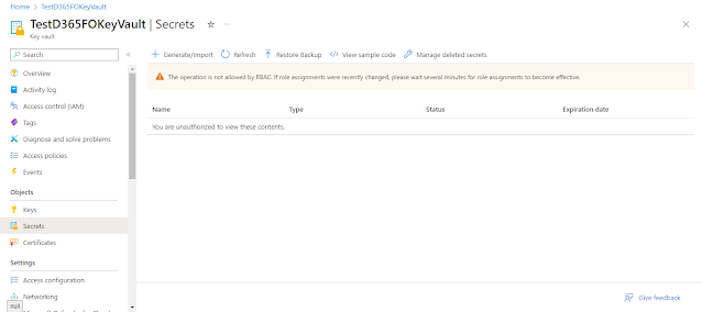 On the Review + create tab, you will see the permissions previously assigned, Click on the “Create” button. Navigate to Secrets page, now we can see the error message is no longer here and we can “Generate/Import” the secrets.