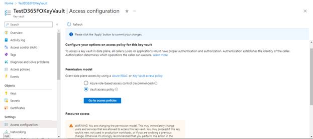 Select the Permission model to “Vault access policy” which applies access control exclusively to KeyVault itself, Click “Apply” to save changes.
