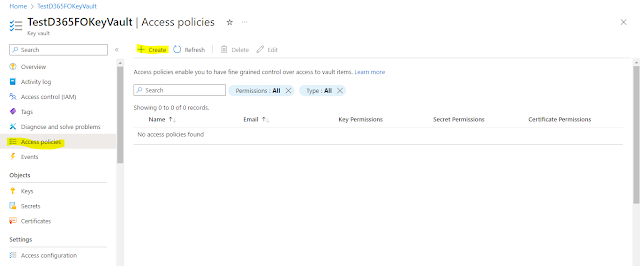 Navigate to the KeyVault you created. Go to Access policies on the left side of the menu.