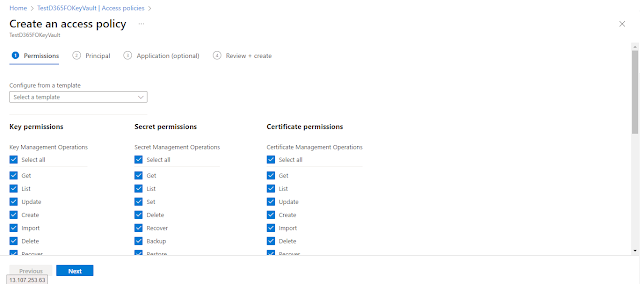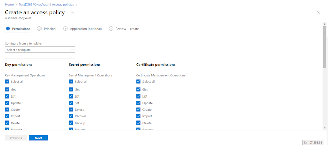 For now, I am assigning all permissions for Key permissions, Secret permissions and Certificate permissions. Click the “Next” button.