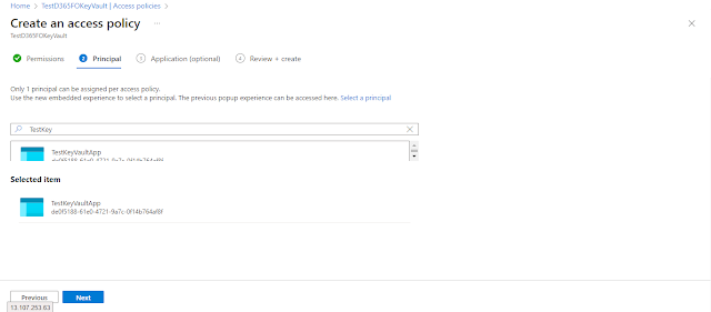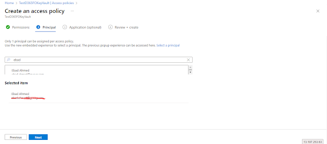 On the Principal window, select the user that you want to grant access to your KeyVault. Click the “Next” button.