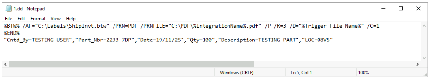 %BTW% /AF="C:\Labels\ShipInvt.btw" /PRN=PDF /PRNFILE="C:\PDF\%IntegrationName%.pdf" /P /R=3 /D="%Trigger File Name%" /C=1 %END%