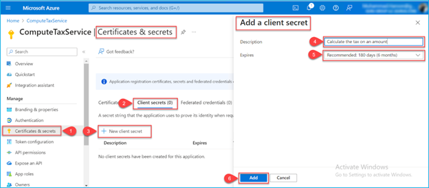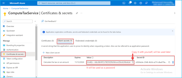 Go to Certificates & secrets and follow the steps: