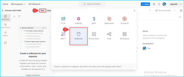 Select the workspace, Create new Collection in the Workspace and follow the steps: