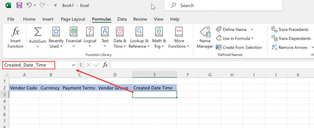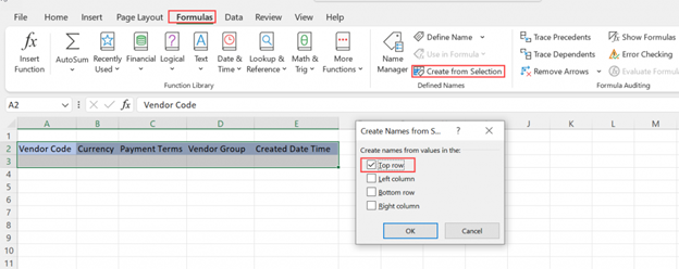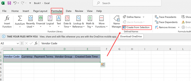 Create a new Excel file and type all the field names as columns, now select them with the next row then go to the ‘Formula’ tab and click on ‘Create from Selection’.