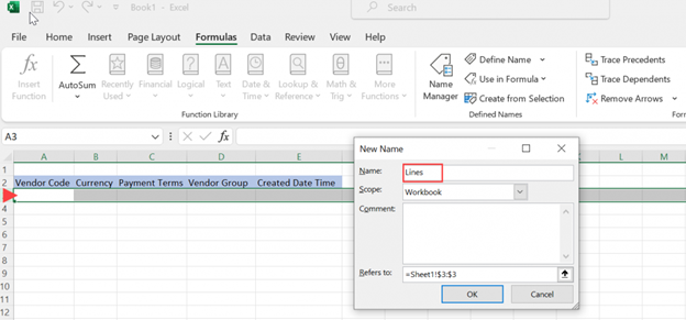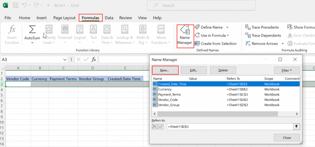After giving individual names we need to select the complete row and give it some name it would be refer as ‘Range’. Select the row and go to Formulas > Name Manager and add a new name.