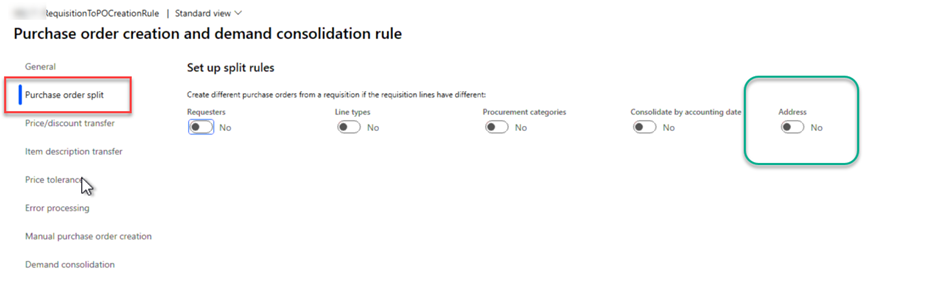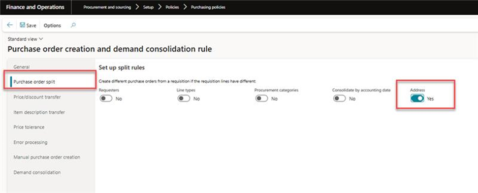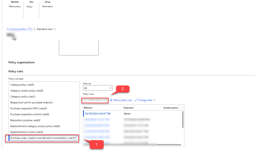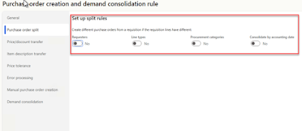 After clicking Purchase policy > select the ‘Purchase order creation and demand consolidation rule ‘> add new rule > if already defined the click on ‘never’