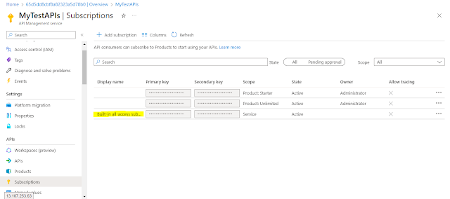We will copy the Primary key from the Built-in-all-access subscription which allows us to use this key for all the APIs in this API management instance.