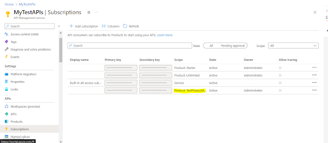 You can see your Product listed in the Products section. Navigate back to Subscriptions on the left side of the menu and you will see a subscription keys are setup for your product you just created.