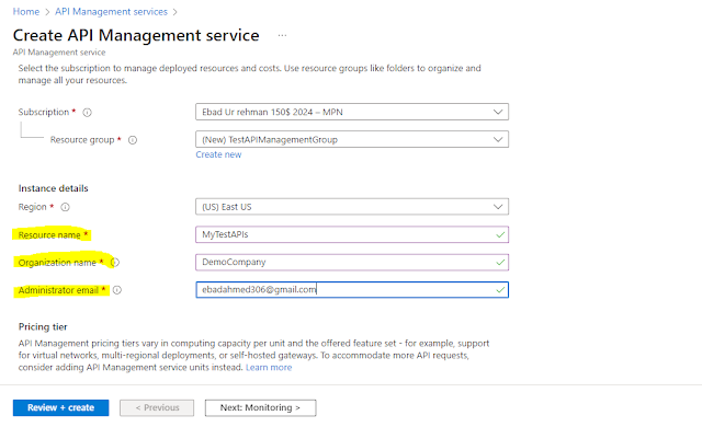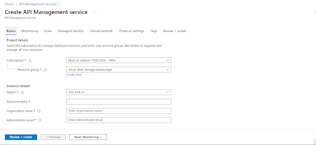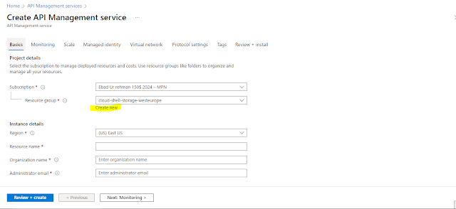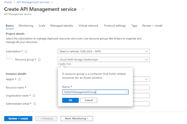 You can see your existing subscriptions here. Additionally, you can choose an existing resource group or create a new one. Let’s create a new resource group for our API management instance.
