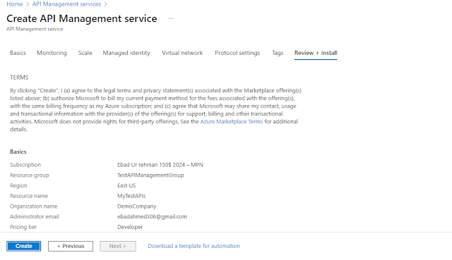 Click OK, new Resource group is created for our API management instance.